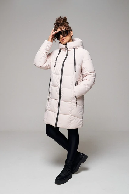 Стильное женское полупальто из гладкокрашеной полиэфирной ткани, на синтетической подкладке, с утепляющим наполнителем холлофайбер, уникального качества, который практически неощутим в весе и толщине, в два раза теплее обычных синтетических утеплителей, легко восстанавливает форму и не теряет ее, обладает эффектом термоса (сохраняет тепло тела). Рекомендованный температурный режим до -25 градусов. Полупальто прямого силуэта, базового классического кроя. Передняя часть изделия с вертикальными подрезами и боковыми функциональными карманами на металлических молниях. Застежка центральная, на разъемную тесьму «молния» с двумя бегунками и ветрозащитной планкой внутри. Застежка-молния имеет длину от линии низа до верхнего края капюшона. Спинка с двумя вертикальными рельефами.