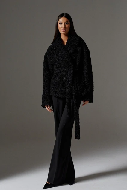 Стильная укороченная шуба прямого кроя выполнена из искусственного меха кудрявой текстуры. Актуальное и стильное изделие вне моды и вне времени, дополнит любой образ в разных стилях. Характеристики: прямой крой, подкладка, крупный воротник с остроугольным лацканом, застежка центральная на петли пуговицы, по низу изделия шлевки, в комплекте пояс из ткани основного изделия, рукав спущен, в боковых швах карманы. Длина изделия 66 , длина рукава 76 от края горловины.
