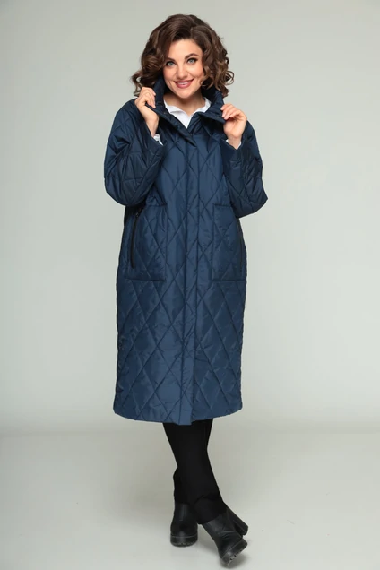 Пальто свободного силуэта с центральной застежкой на молнию, горловина оформлена стойкой с застежкой на кнопки. По переду на уровне бедер накладные карманы с молниями.