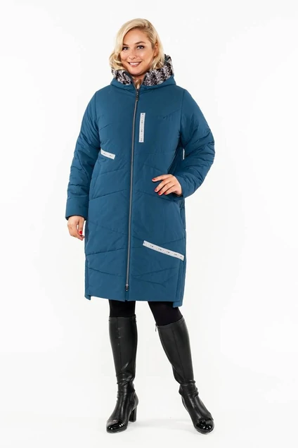 Пальто женское утепленное из ткани плащевой группы, прямого, слегка зауженного к низу силуэта, с застежкой по борту на тесьму-молнию с ветрозащитной планкой. Обтачки молнии выполнены из ткани верха со шнуром- наполнителем внутри.