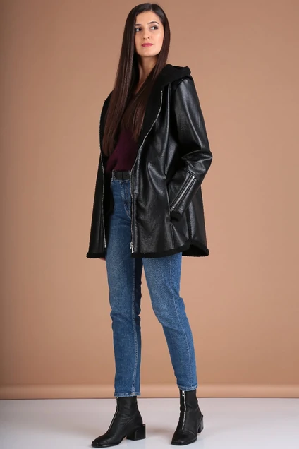 Дубленка выполнена из высокого качества экокожи, верхний слой - полиэстер 100%, нижний - полиуретан 59%, вискоза 41%. Полочка и спинка разрезная состоящая из нескольких частей, рукав одношовный. Карманы внутренние в рельефе полочки. Застежка центральная на молнию. Все швы отстрочены гарусной ниткой. Низ изделия фигурный. По эксплуатационным характеристикам не уступает изделию из натуральных материалов. Длина по спинке 78 см , длина рукава 63 см