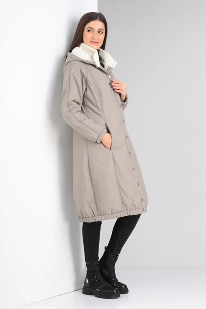 Полочка с рельефами, в которых расположены внутренние функциональные карманы. Застежка центральная на кнопки. Горловина обработана втачным воротником-стойкой, к которому крепится съемный капюшон на кнопках. Спинка с центральным швом. Рукав полуреглан, моделированный кокетками по полочке и спинке. Низ рукава и низ пальто обработаны эластичной тесьмой.Это облегченное пальто на температуру +10+15 гр