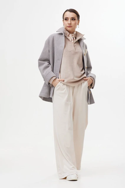 Пальто на подкладке. Силуэт прямой, со спущеным плечом, умеренного объема. В пальто центральная однобортная застежка на петли и пуговицы. Длина пальто ниже уровня бедер. Воротник отложной.