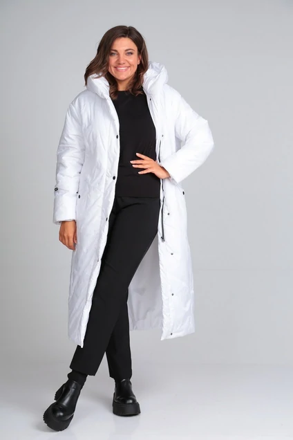 Пальто женское прямого силуэта на утеплителе с центральной бортовой застёжкой на "молнию" и 7 кнопок. Перед с рельефами от проймы до низа и боковыми прорезными карманами с листочкой котороые закрываются на кнопку. Спинка с рельефами от горловины до низа с фигурной стёжкой. Рукав втачной одношовный со спущенной линией плеча, внутри по низу обработана скрытая часть с резинкой. Воротник - капюшон с кулисой и шнуром на фиксаторах.Длина 120 см. , длина рукава 59 см.