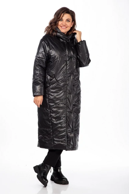 Пальто женское прямого силуэта на утеплителе с центральной бортовой застёжкой на "молнию" и 7 кнопок. Перед с рельефами от проймы до низа и боковыми прорезными карманами с листочкой котороые закрываются на кнопку. Спинка с рельефами от горловины до низа с фигурной стёжкой. Рукав втачной одношовный со спущенной линией плеча, внутри по низу обработана скрытая часть с резинкой. Воротник - капюшон с кулисой и шнуром на фиксаторах.Длина 120 см. , длина рукава 59 см.