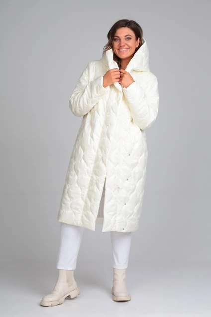 Пальто женское, с центральной застёжкой на тесьму-молнию, отделочная застёжка - планка на потайные кнопки(смещённая). По переду прорезные карманы с втачной листочкой. Рукав втачной 2-шовный с отложным манжетом. Капюшон со средним швом и отрезной отделочной деталью по отлёту воротника. В качестве отделки используется фурнитура. Пальто на подкладке. Длина по спинке 108 см. , длина рукава 67 см.