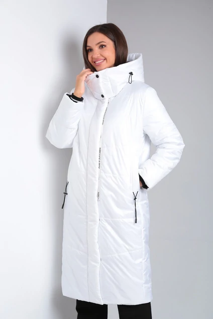 Пальто женское полуприлегающего силуэта, с центральной застежкой на тесьму-молнию и планку (потайные кнопки). Карманы в рельефах с отрезной листочкой (на листочке отделочные кулисы, протянут шнур - резинка с фиксатором) . Спинка с отрезными бочками , по низу рельефов шлицы с застежкой на кнопки. Рукав втачной, одношовный с отделочным манжетом по низу (довяз). Воротник- стойка, нижний воротник из отделочной ткани (довяз). Капюшон объемный (на кнопках) с центральной частью и с отделочной частью по отлету, с застежкой на кнопки. В качестве отделки используется фурнитура и детали. Длина по спинке 109 см. , длина рукава 63 см.