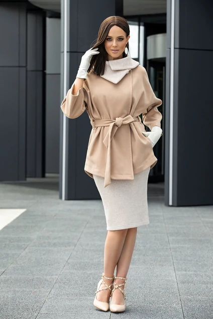 Пальто без подкладки, свободного кроя, рукава летучая мышь, 3/4. Воротник вязаный, выполнен из такой же ткани, как платье. В комплект входит ремень. Застёгивается на пуговицу в области горловины. Длина палтьто от плеча 71 см. длина рукава от горловины 64 см. В пальто также имеются карманы.