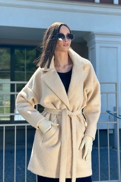Утеплённый жакет, без подкладки в стиле оверсайз. Воротник пиджачного типа, затягивается поясом. Есть карманы. Рукав летучая мышь. Можно носить как верхнюю одежду, в осенний период. Длина пальто 90 см. Длина рукава от горловины 77 см.