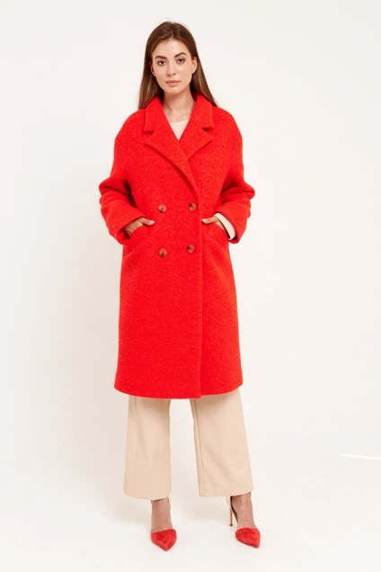 Пальто женское, двубортное, прямого силуэта, длиной ниже линии колен, с приспущенной линией плеча из трикотажного полотна. Застежка на петли, пуговицы. Перед с прорезными функциональными карманами с листочками, листочки с настрочными концами. Рукав длинный, одношовный. Воротник отложной пиджачного типа. Пальто на подкладке.