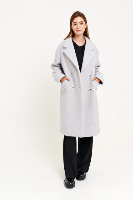 Пальто женское, двубортное, прямого силуэта, длиной ниже линии колен, с приспущенной линией плеча из трикотажного полотна. Застежка на петли, пуговицы. Перед с прорезными функциональными карманами с листочками, листочки с настрочными концами. Рукав длинный, одношовный. Воротник отложной пиджачного типа. Пальто на подкладке.
