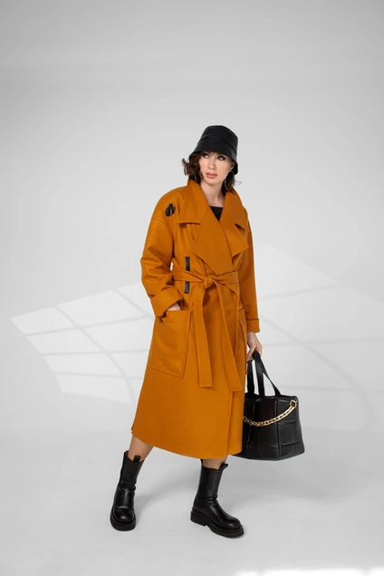 Комплект женский, состоящий из пальто и панамы. Пальто прямого силуэта, на подкладке, со спущенной линией плеча. По переду накладные карманы и прорезные карманы с листочкой. Застежка двубортная с пришивными кнопками. Воротник пиджачного типа. Рукав втачной. В боковых швах разрезы. Пальто декорировано вышивкой. В комплекте пояс из основной ткани и панама, выполненная из экокожи. Пальто относится к демисезонной верхней одежде.