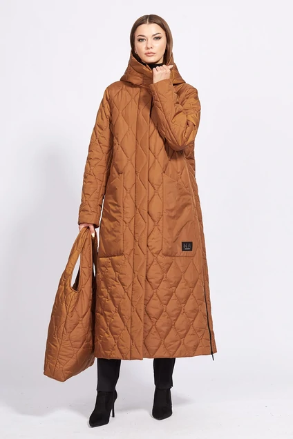 Пальто выполнено из плащевой ткани, простеганной с синтепоном. Пальто А-образного силуэта. Спереди застежка на тесьму-молнию на планке, застегивающейся дополнительно на пробивные кнопки. В боковых швах декоративные молнии. Карманы накладные, фигурной формы. Спинка цельная. Воротник-стойка, со съемным капюшоном. Рукав втачной, двухшовный. Пальто на притачной по низу подкладке. Левый карман декорирован нашивкой. ("Еврозима")