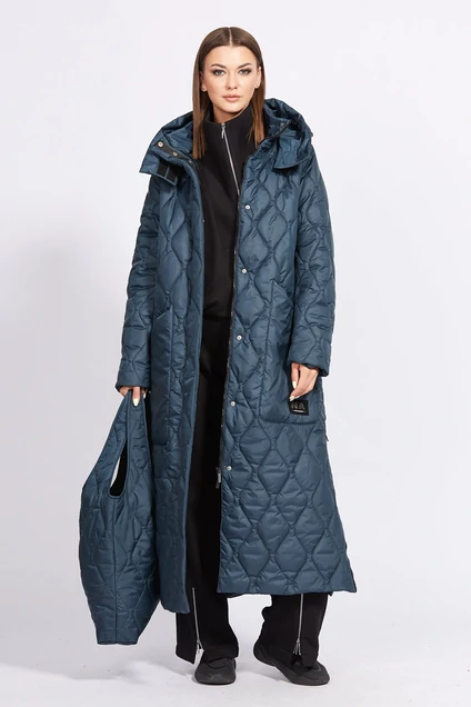 Пальто выполнено из плащевой ткани, простеганной с синтепоном. Пальто А-образного силуэта. Спереди застежка на тесьму-молнию на планке, застегивающейся дополнительно на пробивные кнопки. В боковых швах декоративные молнии. Карманы накладные, фигурной формы. Спинка цельная. Воротник-стойка, со съемным капюшоном. Рукав втачной, двухшовный. Пальто на притачной по низу подкладке. Левый карман декорирован нашивкой. ("Еврозима")