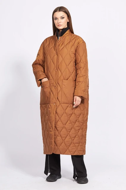 Пальто выполнено из плащевой ткани, простеганной с синтепоном. Пальто прямого силуэта. Спереди застежка центральная бортовая на пробивные кнопки. Карманы накладные. Низ борта округлой формы. Спинка цельная. Воротник-стойка. Плечевой шов спущен. Рукав одношовный. Пальто на притачной по низу подкладке. ("Еврозима")