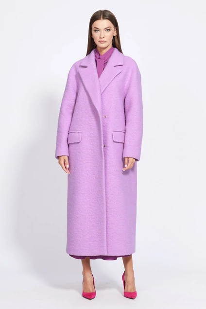 Пальто выполнено из пальтовой буклированной ткани с ворсом. Пальто прямого силуэта, длиной до середины икры. Спереди застежка двубортная на пришивные кнопки, горизонтальные прорезные карманы. Спинка со средним швом со шлицей по низу. Воротник пиджачного типа. Плечевой шов спущен. Рукав одношовный. Пальто на притачной по низу подкладке.