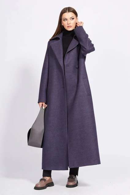 Пальто выполнено из пальтовой ткани. Пальто прямого силуэта, длиной до середины икры. Спереди лацканы и застежка центральная бортовая на два ряда пришивных пуговиц. Карманы прорезные. Спинка со средним швом, в которм обработана шлица. Воротник стояче-отложной с отрезной стойкой. Рукав втачной, двухшовный. Пальто на притачной по низу подкладке. В комплект входит съемный пояс-сумка из основной ткани.