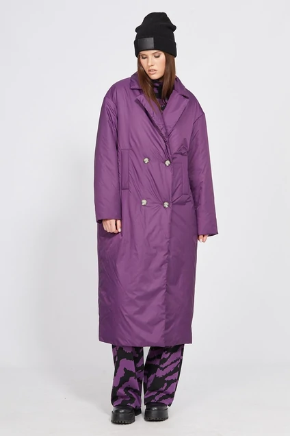 Пальто выполнено из плащевой ткани, утепленной изософтом. Пальто прямого силуэта, длиной до середины икры. Спереди двубортная застежка на два ряда пуговиц и прорезные карманы с листочками. Спинка со средним швом. Плечевой шов спущен. Воротник пиджачного типа. Рукав рубашечного покроя, двухшовный. Пальто на притачной по низу подкладке.