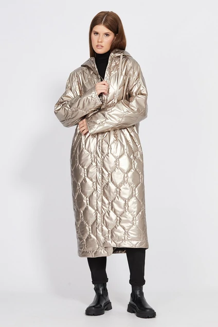 Пальто выполнено из плащевой ткани с блеском, простеганной с изософтом. Пальто прямого силуэта, длиной ниже линии колена. Спереди застежка на пробивные кнопки и прорезные карманы с листочкой. Спинка цельная. Горловина обработана капюшоном. Рукав покроя реглан, одношовный, с плечевой вытачкой.