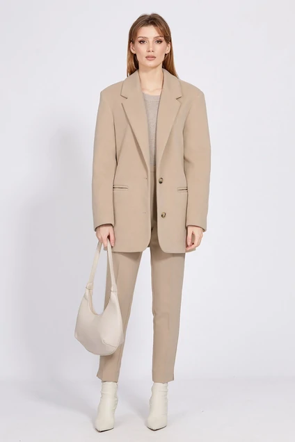 Полупальто выполнено из пальтовой ткани в рубчик. Полупальто прямого силуэта, длиной чуть ниже линии бедра. Спереди карманы в рамку, бортовая застежка на две пуговицы. Горловина пиджачного типа. На спинке рельефы, в которых обработаны шлицы. Плечевой шов удлинен. Рукав втачной, двухшовный. В заднем шве рукава шлица, застегивающаяся на пуговицы. Полупальто на притачной по низу подкладке.