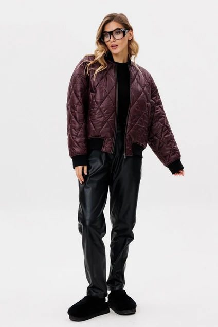 Куртка выполнена из плащевой ткани стеганой с утеплителем Isosoft. Куртка-бомбер О-образного силуэта, длиной выше линии бедер. Спереди центральная застежка на молнию и прорезные карманы. Спинка цельная. Горловина - воротник-стойка. Плечевой шов удлинен. Рукав рубашечного покроя, одношовный. Низ куртки, рукава и горловина на притачной манжете из довяза. Куртка на притачной по низу подкладке.