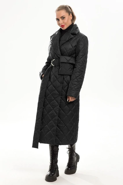 Пальто утепленное с центральной двубортной застежкой на пришивные кнопки, отложным воротником и лацканами. В боковых швах- карманы. Спинка цельная.. Рукав втачной, двухшовный. Пальто со съемным поясом и декоративной сумочкой.