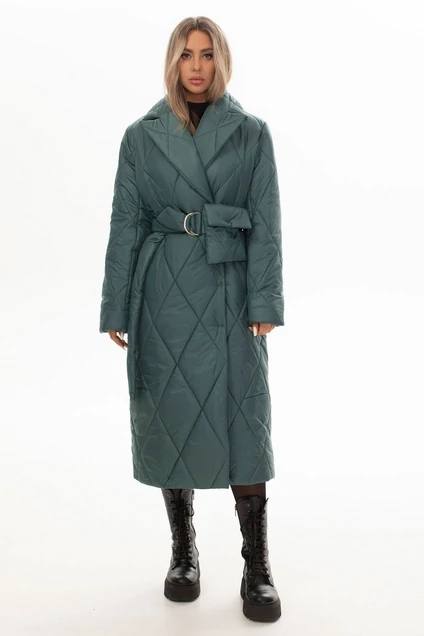 Пальто утепленное с центральной двубортной застежкой на пришивные кнопки, отложным воротником и лацканами. В боковых швах- карманы. Спинка цельная.. Рукав втачной, двухшовный. Пальто со съемным поясом и декоративной сумочкой.