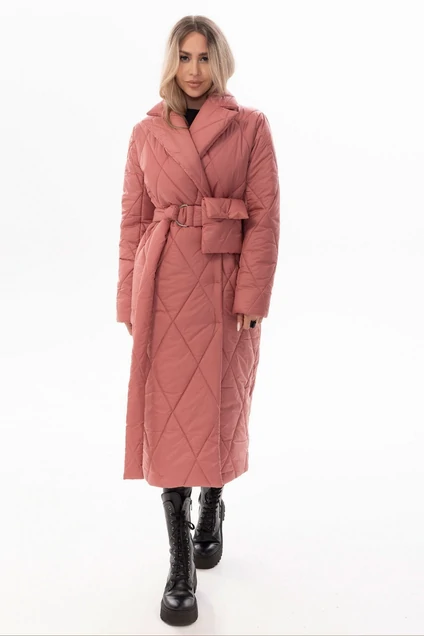 Пальто утепленное с центральной двубортной застежкой на пришивные кнопки, отложным воротником и лацканами. В боковых швах- карманы. Спинка цельная.. Рукав втачной, двухшовный. Пальто со съемным поясом и декоративной сумочкой.