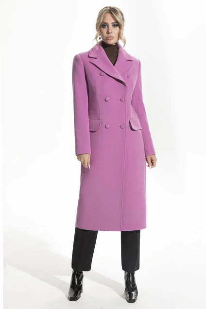 Пальто с центральной двубортной застежкой на петли и пуговицы, отложным воротником и лацканами. На полочках обработаны прорезные карманы с клапаном. Полочки с рельефами, выходящими из проймы. Спинка со средним швом, рельефами, выходящими из проймы. Рукав втачной, двухшовный.