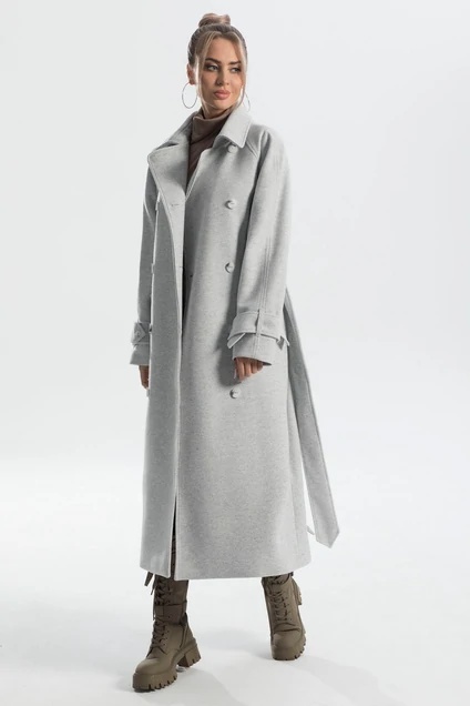 Пальто с центральной двубортной застежкой на петли и пуговицы, втачным воротником со стойкой и отложными лацканами. На полочках обработаны прорезные карманы с листочкой и клапаном. Спинка цельная. Рукав реглан, двухшовный. Пальто со съемным поясом.