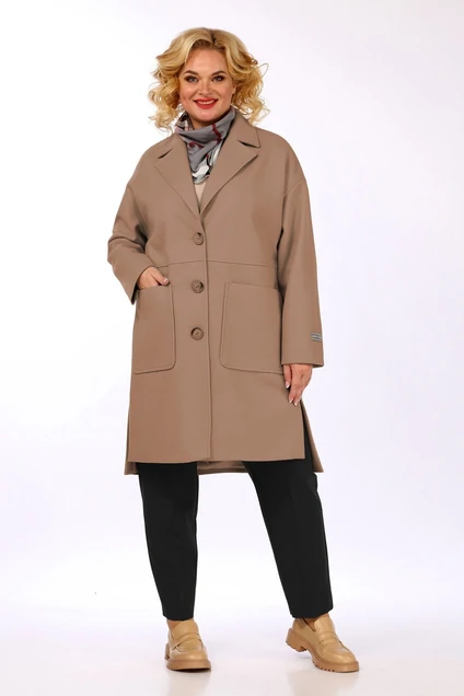Пальто женское демисезонное прямого силуэта из пальтовой ткани. Перед и спинка с подрезом по талии. На переде имеются накладные карманы. Горловина оформлена пиджачным воротником. Застежка центральная на петли и пуговицы. Рукав спущенный. Низ изделия ассиметричный с разрезами в боковых швах.