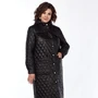 Пальто женское свободного силуэта изготовлено из стеганной курточной ткани на синтепоне. Горловина оформлена капюшоном на стойке, с кулисой и втянутым шнуром с фиксатором. По переду обработаны нагрудные вытачки, верхние накладные карманы с клапаном и нижние накладные карманы. Спинка цельнокроеная. Рукава втачные двухшовные по низу рукава обработаны манжеты с застежкой на кнопки. Низ в изделии фигурный. Сезон — морозная осень, температурный режим до -5С.