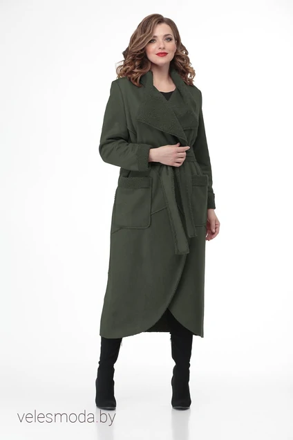 Пальто прямого силуэта из искусственной замшевой ткани на запах,без застежки,выполнено из резных ассиметричных деталей.На полочке настрочены накладные карманы,рукав-втачной,воротник-Апаш,края борта закругленные.Пальто дополнено съемным поясом. Длина по среднему шву 132 см, рукав 66 см.