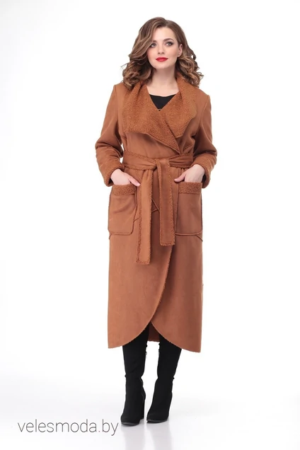 Пальто прямого силуэта из искусственной замшевой ткани на запах,без застежки,выполнено из резных ассиметричных деталей.На полочке настрочены накладные карманы,рукав-втачной,воротник-Апаш,края борта закругленные.Пальто дополнено съемным поясом. Длина по среднему шву 132 см, рукав 66 см.