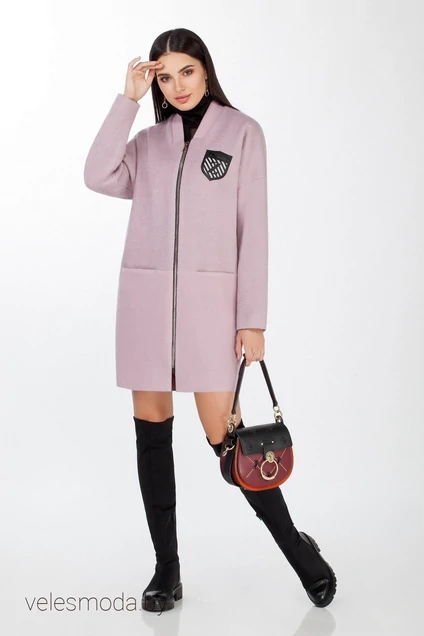 Пальто молодежное свободного силуэта, выполнено из валеной шерсти на сочетании двух тканей: гладкой и фактурной. Длина немного выше колена, хорошо смотрится и с сапогами, и с брюками. Впереди застежка - молния на основе контрастного цвета, такого же цвета и аппликация - карманчик. Воротник-полустойка. Ниже талии подрез и внутренние карманы,по спинке такой же подрез. Линия плеча приспущена, рукав длинный. Пальто полностью на подкладке. Длина пальто сзади по спинке от плечевого шва 88 см, длина рукава пальто 63 см.