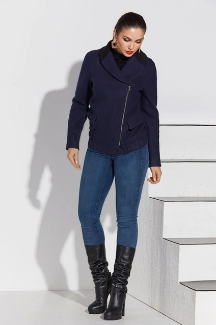 Пальто со стояче отложным воротником и смещённой застёжкой на молнию. Воротник состоит частично из трикотажного полотна (довяза). По низу изделия вставлена резинка по спинке и частично по переду. Перед с карманами с клапанами в нижней части. Спинка со средним швом. Рукава реглан. Пальто на подкладке.