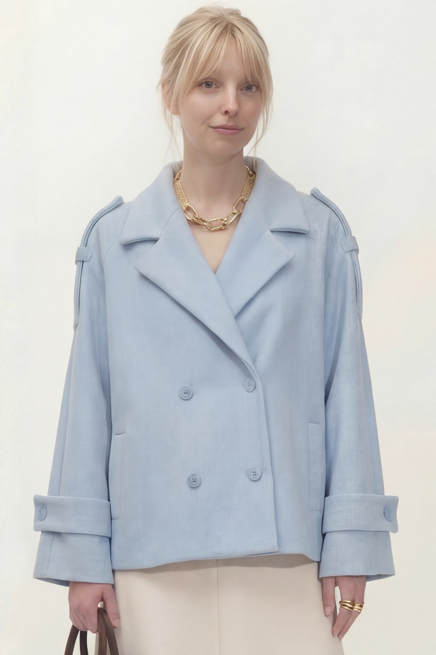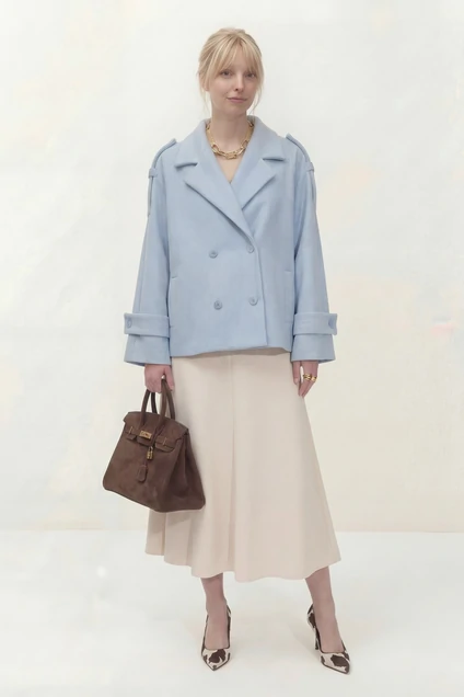 Укороченное двубортное пальто свободного кроя. Широкий английский воротник с заостренными лацканами. Застежка на два ряда пуговиц. Рукав реглан на манжете с пуговицой. На плечах элементы напоминающие погоны. Длина пальто по спинке от высшей точки горловины: 67,5 см. Длина рукава от горловины: 72 см, ОГ: 118-122-126-130-134 см