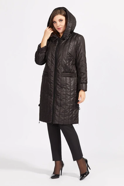 Пальто демисезонное женское прямого силуэта на подкладке с центральной застежкой на тесьму-молнию с двумя бегунками, с капюшоном. Части переда с нагрудной вытачкой и прорезным карманом с листочкой. Спинка цельнокроеная. Рукав втачной двухшовный с отворотом по низу. По боковым швам и капюшону отделочная тесьма. По низу в боковом шве тесьма-молния.