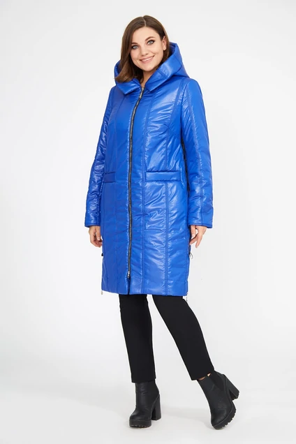 Пальто демисезонное женское прямого силуэта на подкладке с центральной застежкой на тесьму-молнию с двумя бегунками, с капюшоном. Части переда с нагрудной вытачкой и прорезным карманом с листочкой. Спинка цельнокроеная. Рукав втачной двухшовный с отворотом по низу. По боковым швам и капюшону отделочная тесьма. По низу в боковом шве тесьма-молния.