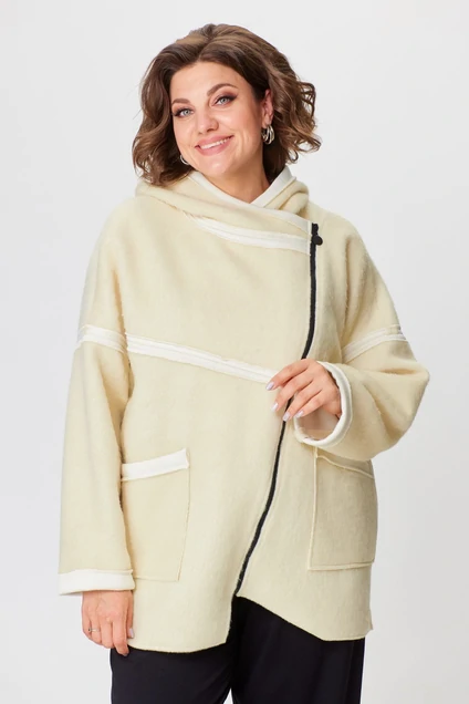 Женское полупальто для повседневной носки выполнено из шерстяной ткани. Полупальто свободного кроя с капюшоном. Плечо спущенное, рукав длинный втачной. Перед изделия с асимметричной косой застежкой на разъемную тесьму-молнию. Спинка прямая цельная. Полупальто украшено рельефными швами срезами наружу. По переду накладные карманы. Низ изделия разноуровневый с необработанным краем. Полупальто смело сочетается с любым низом (юбка, брюки, джинсы) и обувью. Длина по спинке 75 см, длина рукава от горловины 74 см. Изделие подойдет на рост 170 см.