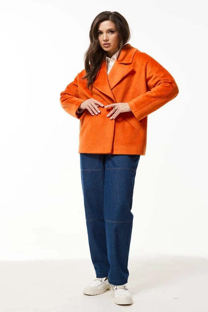 Полупальто двубортное, прямого силуэта выполнено из фактурной ткани. Рукав цельнокроеный с ластовицей. Карманы прорезные с листочкой. Воротник с отрезной стойкой. Спинка со средним швом. Пальто на подкладке.