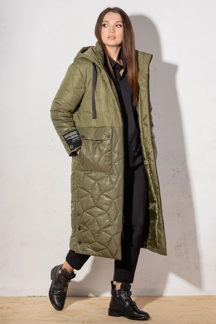 Пальто женское утеплённое осень-зима прямого силуэта с капюшоном, выполнено из стёганной ткани на утеплителе изософт, комбинированное. По переду большие накладные карманы с двумя входами, верхний закрыт клапаном на кнопки. Воротник стойка. Рукава одно шовные втачные. Боковые швы заканчиваются разрезами, которые застёгиваются на кнопки. Подкладка простёгана с утеплителем изософт.