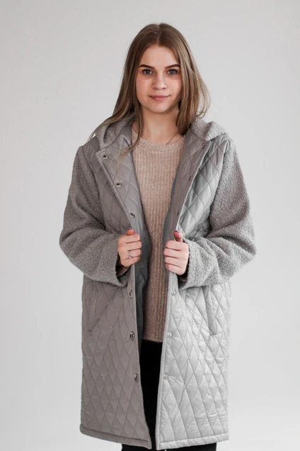 Пальто прямого силуэта. На подкладке. Спущенное плечо. Карманы листочка. Капюшон. Застёжка кнопки. Длина изделия: 91 см Длина рукава: 63 см
