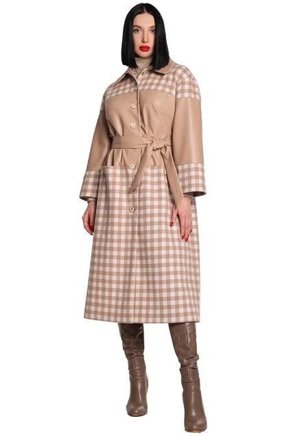Пальто демисезонное прямого силуэта с центральной застежкой на петли-пуговицы. Выполнено в оригинальном сочетании фактур - пальтовой ткани и эко-кожи. По спинке кокетка, средняя часть из кожи и нижняя часть со средним швом и шлицей. По переду кокетка, средняя часть из кожи с нагрудными вытачками. Карманы в горизонтальных подрезах. Воротник стояче-отложной. Линия плеча спущена. Рукав рубашечного покроя с горизонтальными подрезами. Пальто на подкладке. Дополнено съемным поясом из кожи.