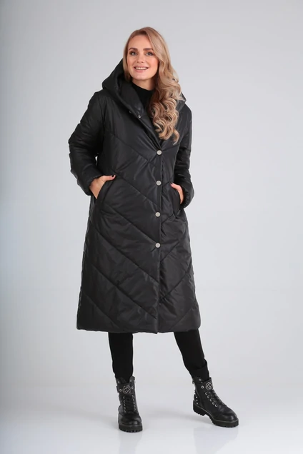Утепленное женское двубортное пальто свободного кроя c капюшоном. Утеплитель синтепон (200г/м2) ,изделие предназначено для эксплуатации в осенне-зимний период с температурой воздуха до -10 градусов по Цельсию (указанная температура комфорта может зависеть от индивидуальной восприимчивости к холоду). Сезон-евро зима. На полочке прорезной карман с листочкой. Рукав прямой, втачной. Спинка цельная. По переду застежка на металлические кнопки. Изделие из ткани с водоотталкивающим эффектом. Длина изделия по спинке в размерах (48-50-52)-113см, размерах(54-56-58)-118см.