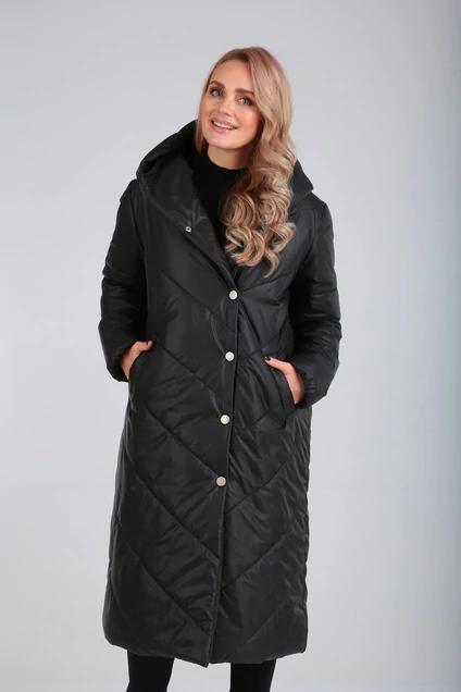 Утепленное женское двубортное пальто свободного кроя c капюшоном. Утеплитель синтепон (200г/м2) ,изделие предназначено для эксплуатации в осенне-зимний период с температурой воздуха до -10 градусов по Цельсию (указанная температура комфорта может зависеть от индивидуальной восприимчивости к холоду). Сезон-евро зима. На полочке прорезной карман с листочкой. Рукав прямой, втачной. Спинка цельная. По переду застежка на металлические кнопки. Изделие из ткани с водоотталкивающим эффектом. Длина изделия по спинке в размерах(46-48)-108см, размерах (50-52-54)-113см, размерах(56-58-60)-118см. На модели размер 44 (параметры модели ОГ-94, ОТ-74, ОБ-96 рост 174см)