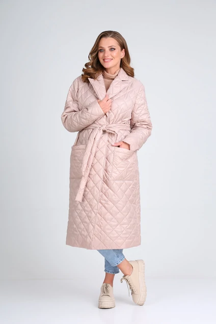 Пальто утепленное с центральной двубортной застежкой на пришивную пуговицу, отложным воротником и лацканами. По переду – накладные карманы. Спинка цельная. Рукав длинный втачной, двух шовный. Пальто со съемным поясом.