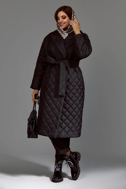 Пальто женское свободного силуэта выполнено из стеганой ткани (не тянется). Вырез горловины – отложной воротник с лацканами, плечо спущенное, рукав втачной. Застежка потайная на две пришивные кнопки. Декором служит металлическая лейба на лацкане. По талии пальто фиксируется поясом из стеганой ткани. Длина пальто – 114 см. Длина рукава – 62 см.