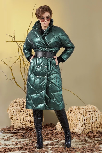 Зимнее удлиненное пальто прямого силуэта. Застежка двубортная на кнопки. Рукав спущенный, прямой, длинный. Низ рукава на широкой манжете (довяз). Воротник пиджачного типа. Карманы прорезные с листочками. Спинка прямая. Подкладка – дизайнерская вискоза 100%