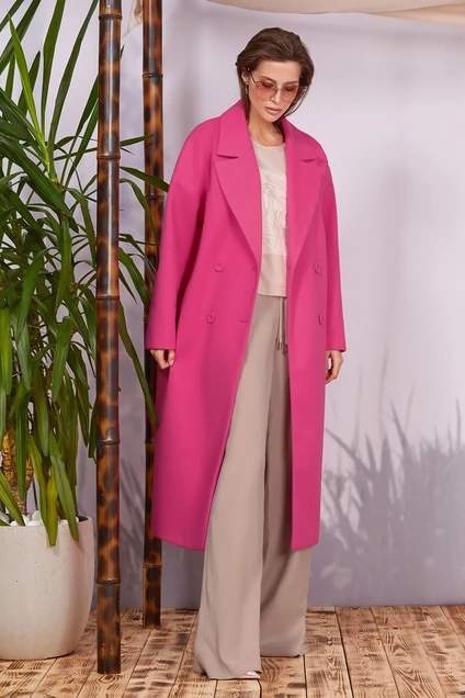Стильное пальто oversize выполнено из трикотажного шерстяного полотна. Изделие длиной ниже линии колена. Спущенное плечо. Комбинированный покрой рукава. Изделие с двубортной застежкой на пуговицы. Воротник пиджачного типа. Карманы прорезные с листочкой. Спинка прямая со средним швом и шлицей. Рукав длинный. Изделие на авторской подкладке